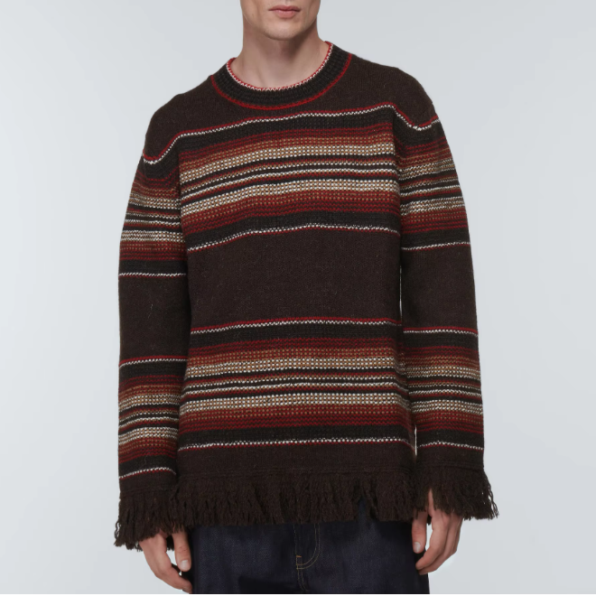 Men Loose Knit Pullover Vintage Multicolor Stripe Fringe Hem Wool Sweater