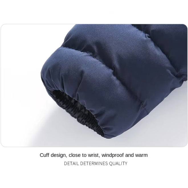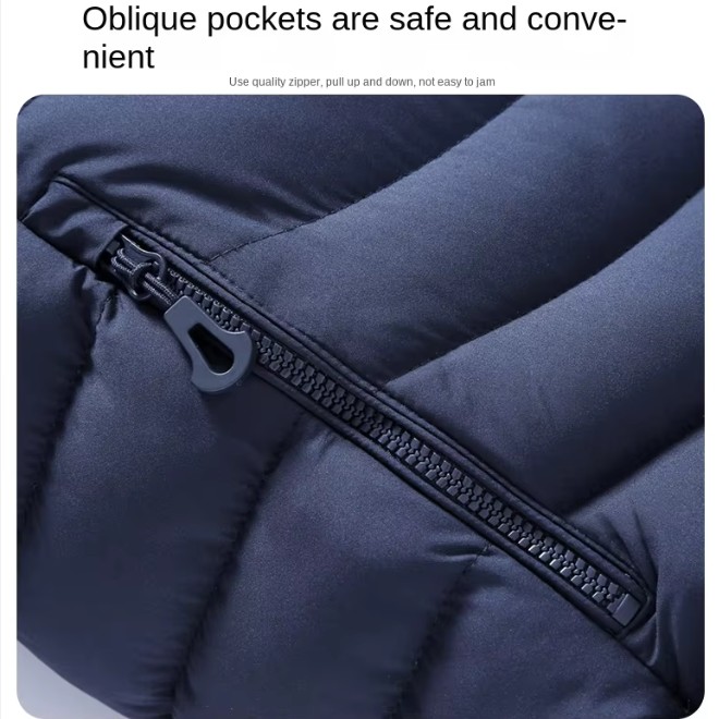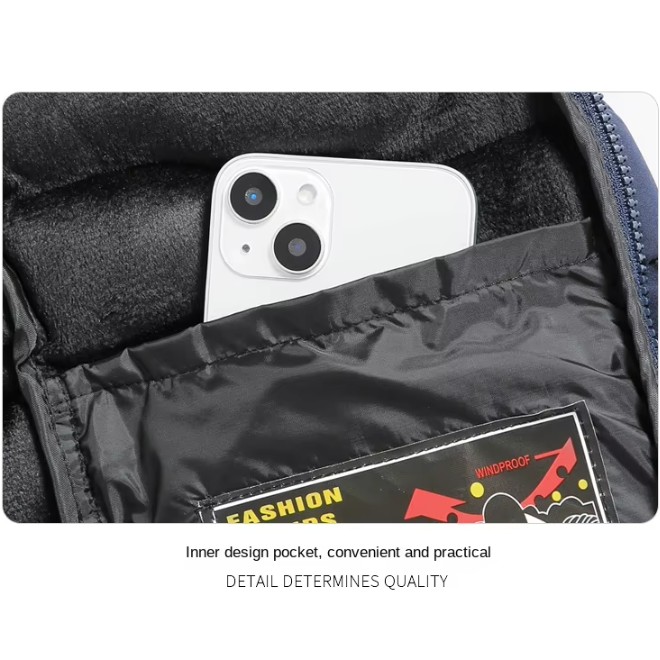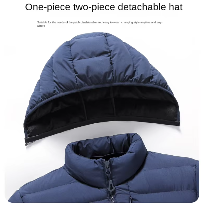 Feature: Windproof and cold-proof. One-piece two-piece detachable hat. Oblique pockets are safe and convenient. Chest pocket personalized fashion.